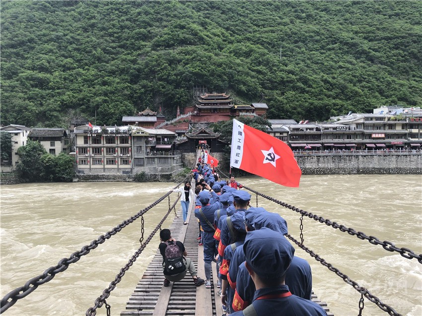 10月29日,瀘定橋一如既往地?zé)狒[,深秋微風(fēng)襲來,粗壯鐵鏈和結(jié)實(shí)木板構(gòu)成的橋身輕晃,到此參加“不忘初心、牢記使命”主題教育的黨員干部們擎著黨旗,身著紅軍服,踩著當(dāng)年紅軍的腳步在橋上走過。