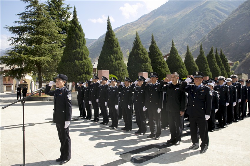 州政府副州長(zhǎng)、州公安局長(zhǎng)李強(qiáng)率參與民警向紅軍飛奪瀘定橋紀(jì)念碑敬獻(xiàn)花籃,莊嚴(yán)鞠躬,表達(dá)沉痛哀思。在紅色圣地,民警們還面對(duì)鮮紅黨旗,舉起右拳,重溫入黨誓詞,向革命烈士致以最崇高的敬意。