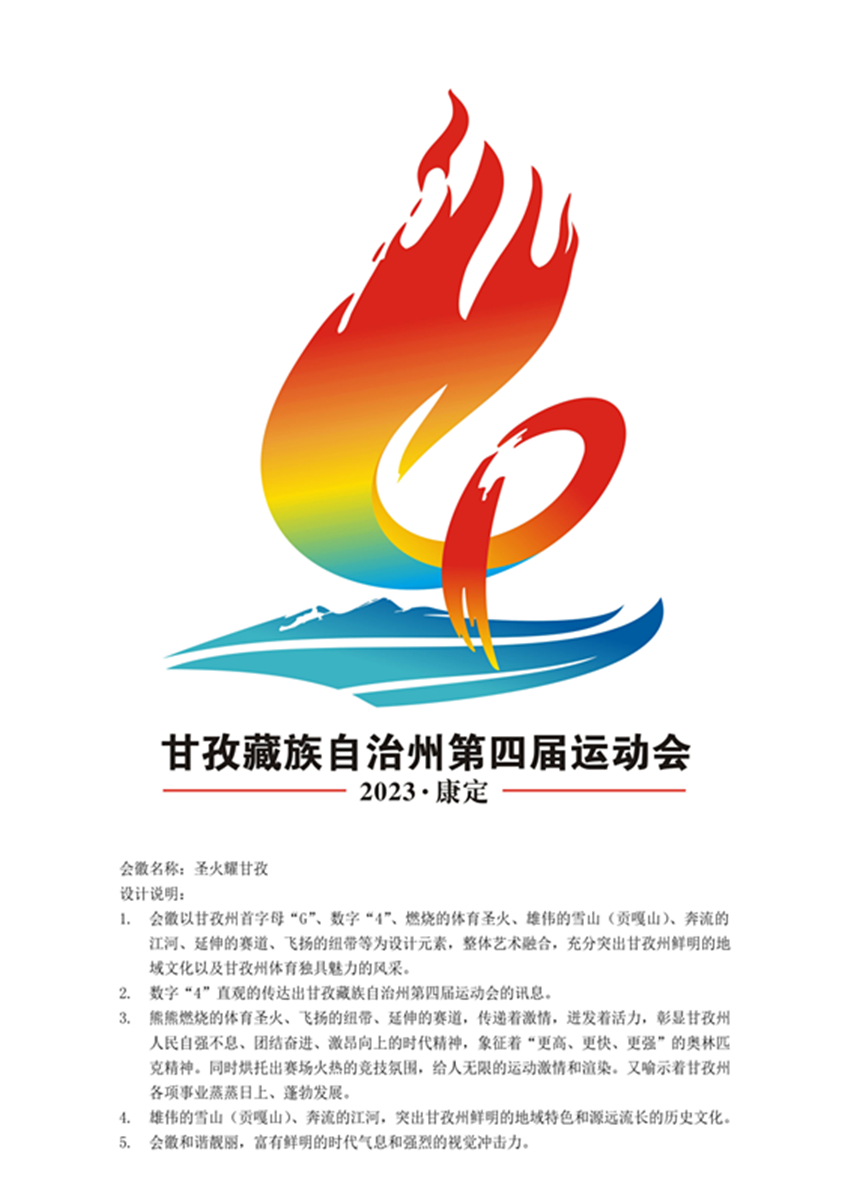 據(jù)王拓進介紹,會徽設(shè)計靈感來自網(wǎng)上看到的貢嘎雪山,所以作品以甘孜州首字母“G”、數(shù)字“4”、燃燒的體育圣火、雄偉的雪山(貢嘎山)、奔流的江河、延伸的賽道、飛揚的紐帶等為設(shè)計元素。數(shù)字“4”直觀地傳達(dá)出甘孜州第四屆運動會的訊息;雄偉的雪山(貢嘎山)、奔流的江河,突出甘孜州鮮明的地域特色和源遠(yuǎn)流長的歷史文化;熊熊燃燒的體育圣火、飛揚的紐帶、延伸的賽道,傳遞著激情、迸發(fā)著活力,彰顯甘孜州人民自強不息、團結(jié)奮進、激昂向上的時代精神,象征著“更高、更快、更強”的奧林匹克精神,同時烘托出賽場火熱的競技氛圍,給人無限的運動激情和渲染,又喻示著甘孜州各項事業(yè)蒸蒸日上、蓬勃發(fā)展。