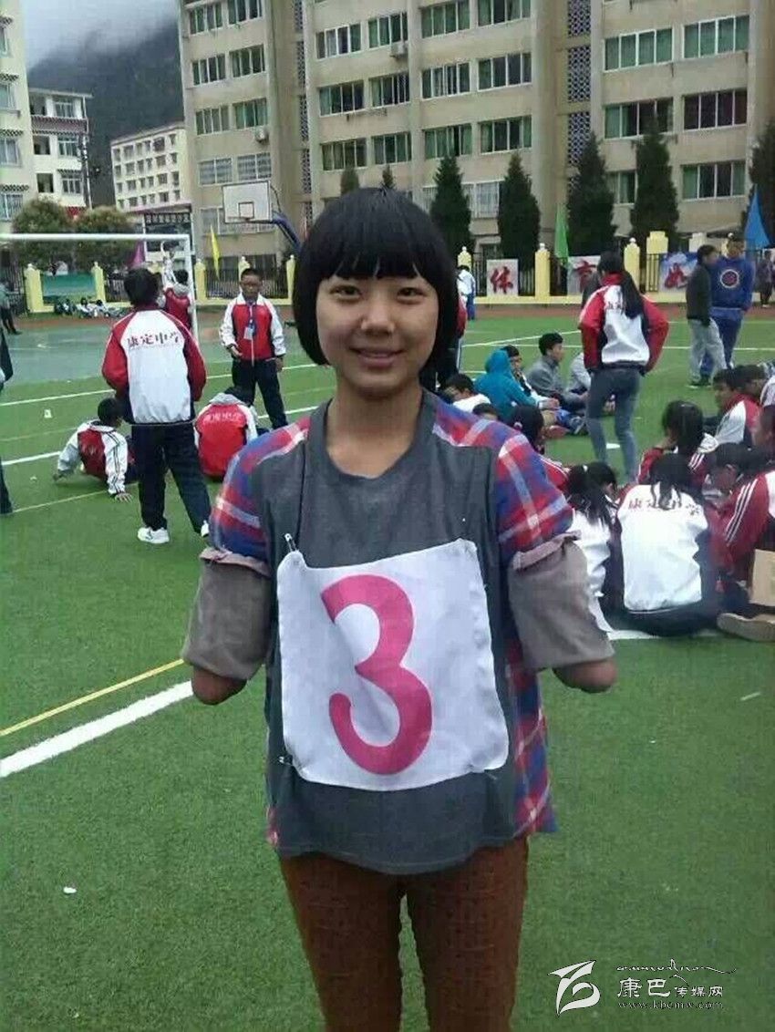 在康定中學(xué)校園里,你會邂逅這樣一位女孩:臉上永遠(yuǎn)燦爛著陽光般的微笑,雙眼永遠(yuǎn)閃爍著自信樂觀的光芒。教室里,她聚精會神地聽課;圖書館里,她專心致志地讀書;操場上,她身輕如燕地奔跑;寢室里,她開心爽朗地和同學(xué)交流??赡阕屑?xì)一看,她竟然沒有雙臂,就像折翼的天使。她就是該校高2016屆8班學(xué)生,羌族女孩許方燕。行走在高原的風(fēng)中,她是一幀讓每一個人內(nèi)心泛起感動漣漪的美麗風(fēng)景……