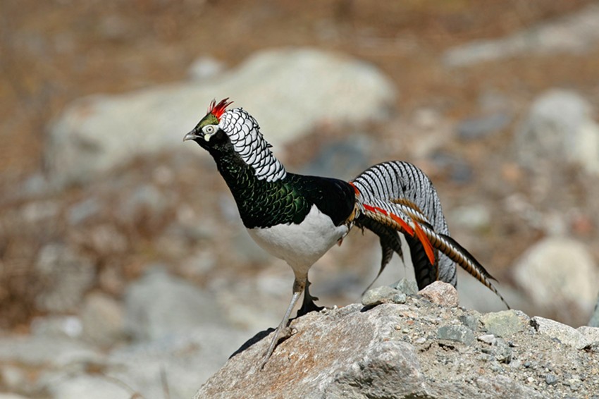 白腹錦雞(學(xué)名:Chrysolophus amherstiae):藏語譯音:甲嚇破呷妞仁 別名:銅雞、寬寬雞 國家II級(jí)保護(hù)動(dòng)物,見于瀘定、康定、丹巴、九龍等。 雄鳥全長約140厘米,雌鳥約60厘米。雄鳥頭頂、背、胸為金屬翠綠色;羽冠紫紅色;后頸披肩羽白色,具黑色羽緣;下背棕色,腰轉(zhuǎn)朱紅色。飛羽暗褐色。尾羽長,有黑白相間的云狀斑紋。腹部白色。嘴和腳藍(lán)灰色。雌鳥上體及尾大部棕?