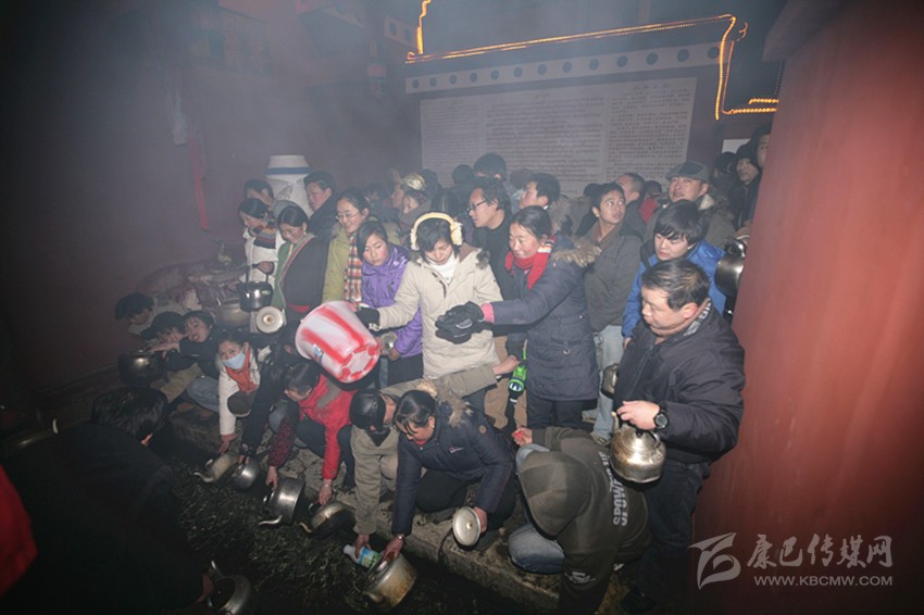“每年大年三十我都會在這里來搶頭水,傳說郭達(dá)山神和跑馬山仙女會化身為一對金鴨在里面戲水。老人們說大年三十到正月初一‘翻年’那個(gè)節(jié)點(diǎn)來取水,就能看見金鴨,而水也等同于仙液?!痹趧倓偰隄M40歲的陳先生兒時(shí)的記憶中,這里每到春節(jié)“就會有人提著水桶,拿起茶壺排起長龍來看金鴨,搶頭水?!?/span>