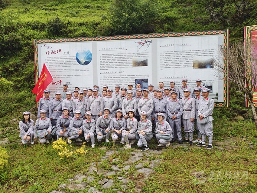 王琴帶著身穿紅軍服裝的游客行進(jìn)在“紅軍小道”上,具有川西民居建筑風(fēng)格的農(nóng)舍掩映在青山綠水間。在紅軍戰(zhàn)士泉水療傷的雕像前,一個(gè)鵝卵石壘砌的池子里,溫泉水碧波蕩漾,游客在這里體驗(yàn)泡腳,凝望著紅軍雕像,仿佛聽(tīng)到了86年前的槍炮聲。