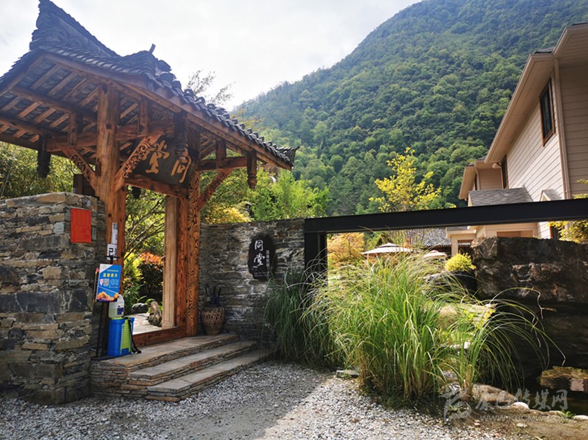 走過(guò)碎石鋪就的院壩,幾株狗尾巴草隨風(fēng)搖曳,再穿過(guò)古韻十足的大門(mén),同堂溫泉民宿的故事正式啟幕。
