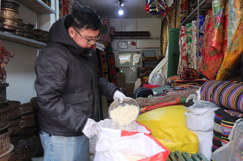 這個(gè)30多平方米的商鋪內(nèi)人頭攢動(dòng),地毯、布料、銅鍋……各種物品應(yīng)有盡有?!疤鹤佑昧舜蟀肽炅耍|(zhì)量還是這么好,不僅沒(méi)變形,顏色還是那么鮮艷,所以今天專門來(lái)再買一個(gè)拿回家備用。”客人尼瑪說(shuō)。