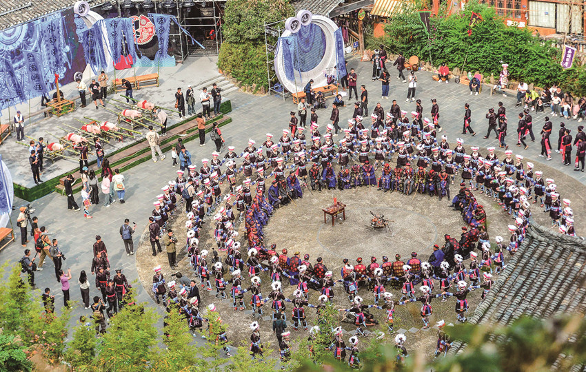 在貴州省黎平縣肇興侗寨,侗族群眾身著節(jié)日盛裝參加侗年踩歌堂活動。