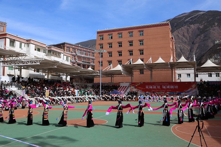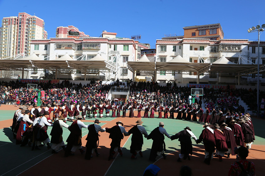 弦音聲動鬧新年,紅綾長袖舞春風,千人弦子鍋莊,唱出龍年大團圓,踏出幸福新舞步……2月13日,在巴塘縣全民健身活動中心舉行的春節(jié)暨藏歷新年系列活動“文化·點靚生活”——巴塘縣五彩藏鄉(xiāng)藝術周弦子鍋莊展演活動現(xiàn)場喜氣洋洋、人頭攢動,上千名群眾身穿節(jié)日盛裝,拉起弦胡,載歌載舞,共同慶祝新春佳節(jié),祈盼龍年國泰民安、風調雨順。圖為活動現(xiàn)場。 敖梅 李穎/文 格桑澤仁/圖
