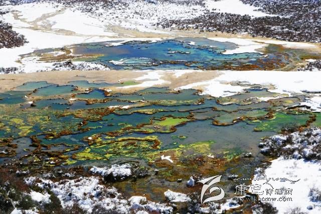 泉華灘位于貢嘎山西坡,為鈣化地貌,灘長(zhǎng)900多米,寬100余米,依山而下形成5個(gè)泉華階地。每個(gè)階地上有數(shù)十個(gè)大小不同、形態(tài)各異的五色彩池,池中有羌活魚自在游弋。在泉華灘的頂上有一道趵突泉,不間斷地突然從地底噴發(fā),十分壯觀。