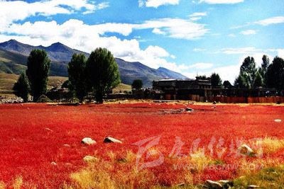 “紅草地”的后面是一個小村莊,村莊的周圍也有一些白楊樹,在秋風(fēng)的熏陶下大都已變成金燦燦的黃色?!凹t草地”的四周被幾座大山所環(huán)抱。晚秋中,五顏六色的大片色塊亮麗張揚(yáng)地組合在一起,水天同彩地纏綿出一幅斑斕、夸張、濃墨重彩的油畫山水。在黃綠相間的楊樹和藍(lán)天白云的映襯下,紅得特別的燦爛。一片只有足球場大的紅草地,每年只有十多天的風(fēng)光,是成了稻城一個標(biāo)志性景點。